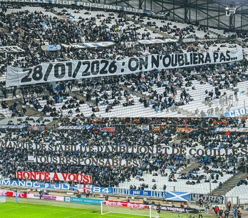 正是这场被认为“已到手却又飞走”的出局,点燃了球迷的怒火。昨日比赛中,马赛球迷的情绪持续发酵,看台上悬挂起措辞极其尖锐的横幅,横幅上写着“缺乏稳定性、野心和胆量…… 所有人都有责任”,直指俱乐部缺乏稳定性、缺乏雄心、也缺乏担当,并将责任归咎于管理层与球队整体。